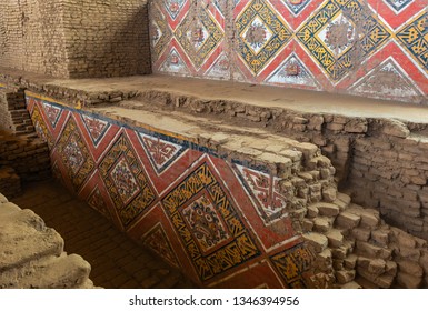 In the episode, I discuss the two great Moche temples: the Temple of the Sun and the Temple of the Moon (respectively referred to as the Huaca del Sol, and the Huaca de la Lune). While there is not much to show you from the long-since looted Temple of the Sun, there are a number of gorgeous murals that have been discovered in the Temple of the Moon. See the exterior of the Temple of the Sun on the left, and a slideshow of images of the Temple of the Moon below.